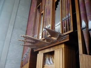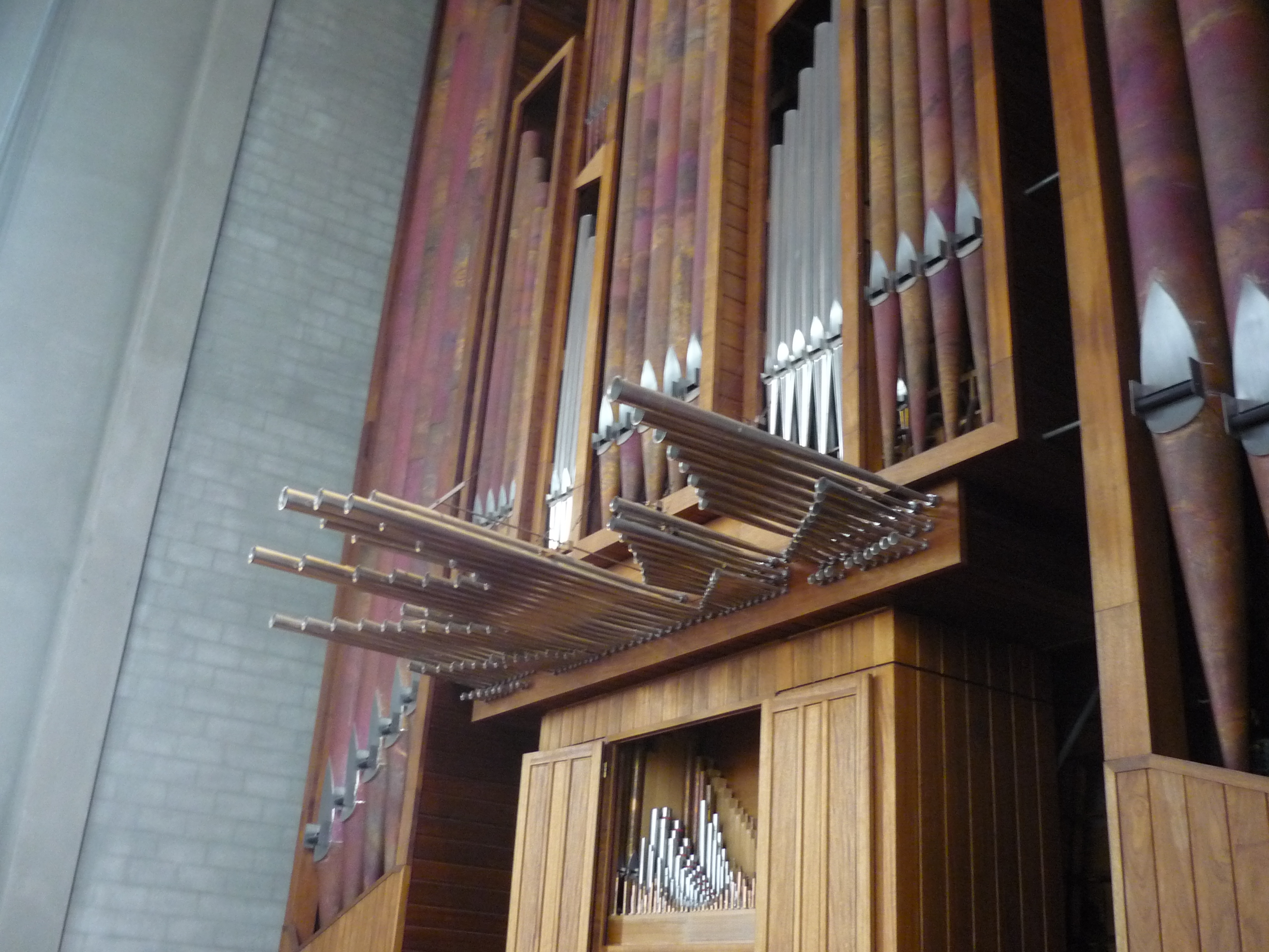 This organ was built by the Dutch organ builder D.A. Flentrop in 1965, and is particularly noteworthy as one of the first large all-tracker (mechanical) action organs built in the 20th Century, and became important in the movement towards traditional organ building practices. It was also the largest organ that Flentrop had built (4 manuals, 55 stops). My descriptions cannot possibly do the organ justice, you need to visit the cathedral in person to truly understand how large the organ appears. The cathedrals ceilings are 85 feet high, and the organ is on a gallery about 20 feet up. That puts the organ at somewhere between 45-55 feel tall. When I think about what was involved in getting all of those mechanical linkages to work across a span of that distance…