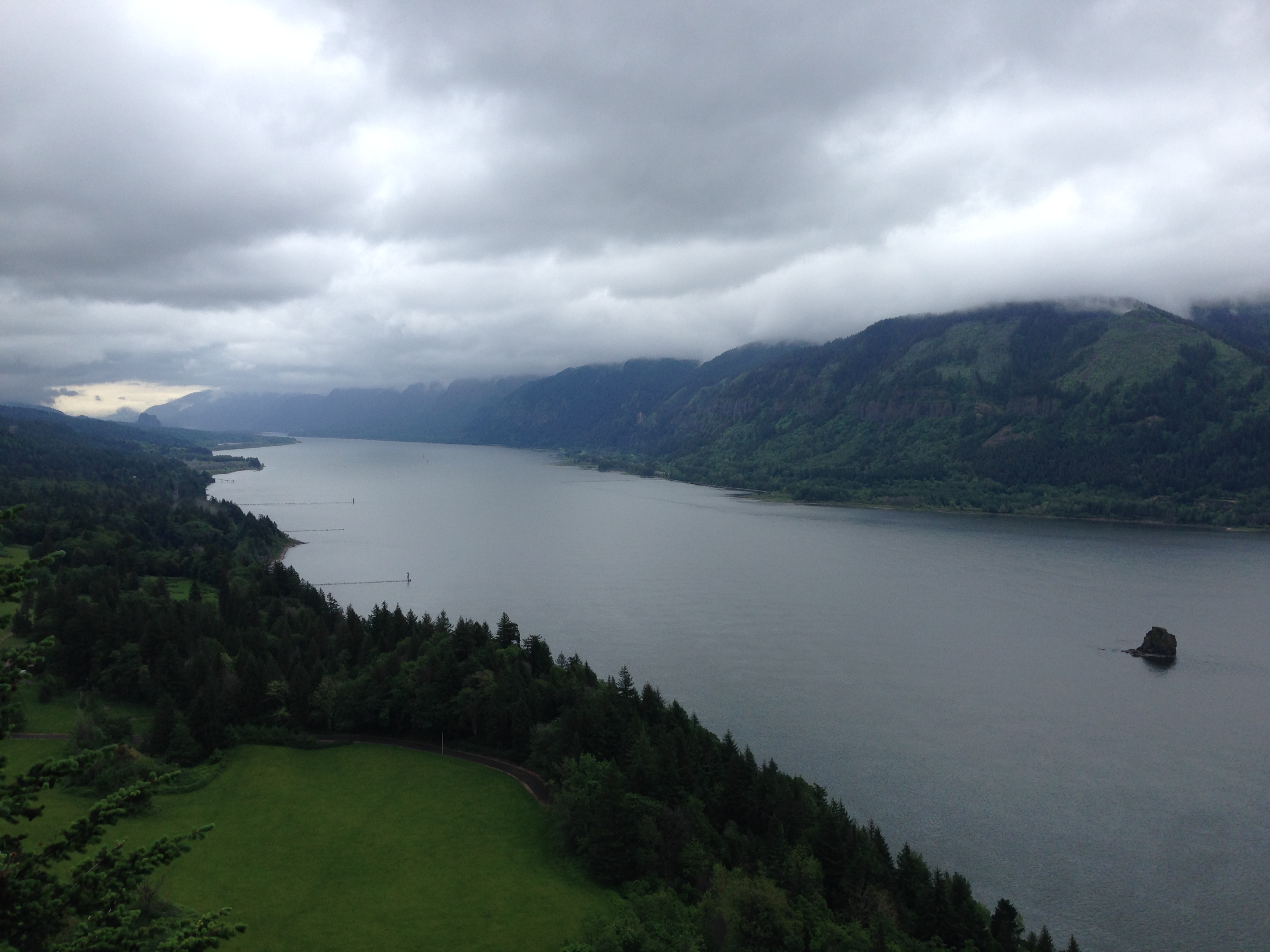 I drive around one corner of the road and find a view so beautiful that I have to pull over in my rattletrap van to take it in, just for a second. I feel a little foolish, pulling off in my blue exclamation point of a van (LENTS FEED AND SEED, reads the peeling sponsor logo on the side), but I figure that anybody that notices is probably proud that their backyard can create such a reaction. The bruised and brooding sky is all gray light, light gray highlights and dark gray shadows play in the gray clouds and are mirrored on the surface of the gray water. It reminds me of a church, or else it reminds me of Ingmar Bergman reminding me of a church. There are old, stylish concrete pylons holding up the highway above the dramatic drop into the Gorge, and the cliff face is held back from sweeping away the road by rusted chain-link nets.