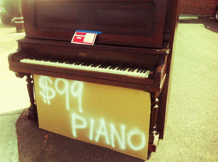 Classic Pianos, on Milwaukie and Powell here in Portland, has been having a basement sale to clear out inventory. As I was riding a bus into Downtown, that sign above, $99 piano, caught my eye. I don’t care what the piano sounds like, or how it’s been taken care of. If it plays and is capable of holding tune, 99 dollars is a ludicrously low price for a piano. I had an appointment with my therapist, but the whole time I was in session, a small part of my brain was arguing: “Dude, you have no money.” “Yeah, but, come on, I have $99. And you’re never going to see that price again.” “But you’re starting school next week, you’re going to need money.” “But it’s a piano.”
